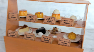 飲食店オーナー様からご依頼いただき、カフェのディスプレイ用としてミニチュアスイーツのショーウィンドウを制作しました。プリン、かぼちゃプリン、シュークリーム、ガトーショコラ、ベイクドチーズケーキ、バニラアイス、アフォガードなどを樹脂粘土で再現したオーダー作品をご紹介します。